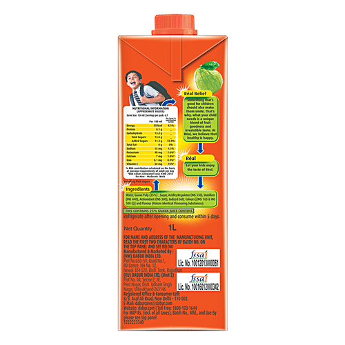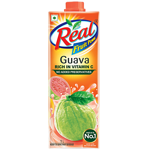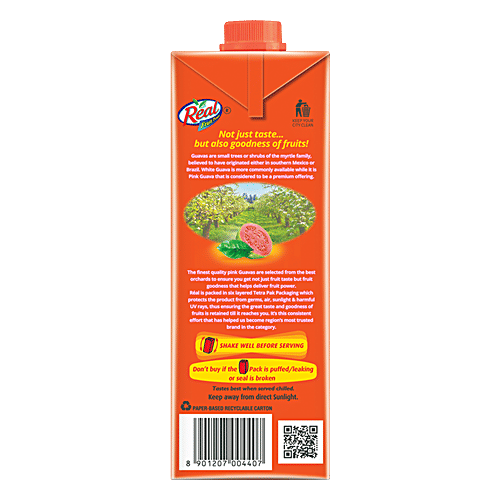 Real Fruit Power Guava Juice, Every Real fruit beverage is made from the juice of best quality fruits only.Real undergoes 108 quality tests at various checkpoints for quality, fruit goodness, taste, nutrition and food safety.