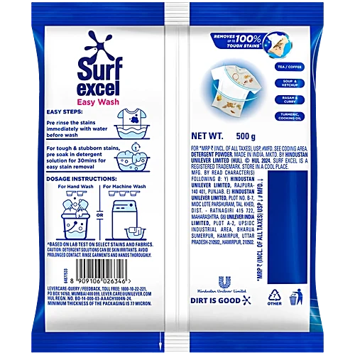 Surf Excel Easy Wash is a superfine powder that removes tough stains in a jiffy and leaves no residue on your clothes. Being a superfine and fluffy powder, it dissolves easily and reaches the stain, removing it easily. Its engineered formula with superior technology unleashes the power of 10 Hands that is effective in removing the toughest of stains such as mud, ink, oil, ketchup, curry stain, and chocolate very easily