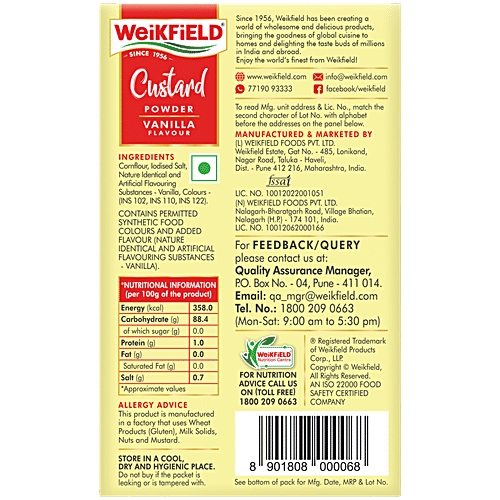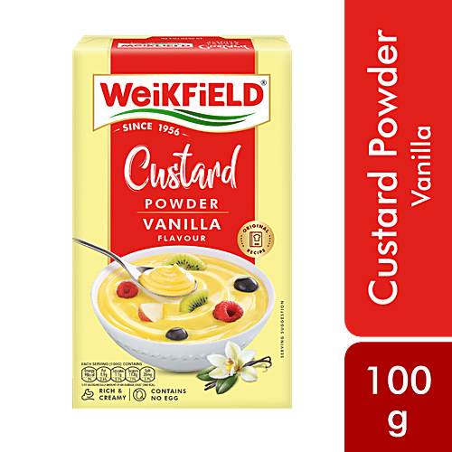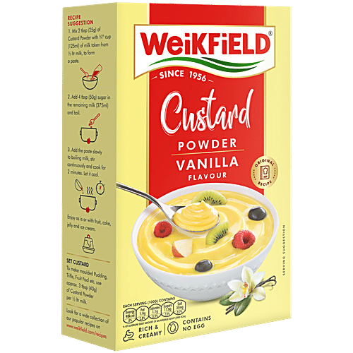 Weikfield Custard Powder is your perfect partner for whipping up delicious, velvety desserts in minutes. Made from high-quality ingredients, it blends effortlessly to create a rich, creamy custard that pairs beautifully with fruits, jelly, cakes, and puddings. Ideal for both everyday treats and special occasions, this classic vanilla-flavoured custard adds a touch of sweetness and nostalgia to every bowl.